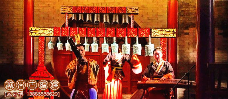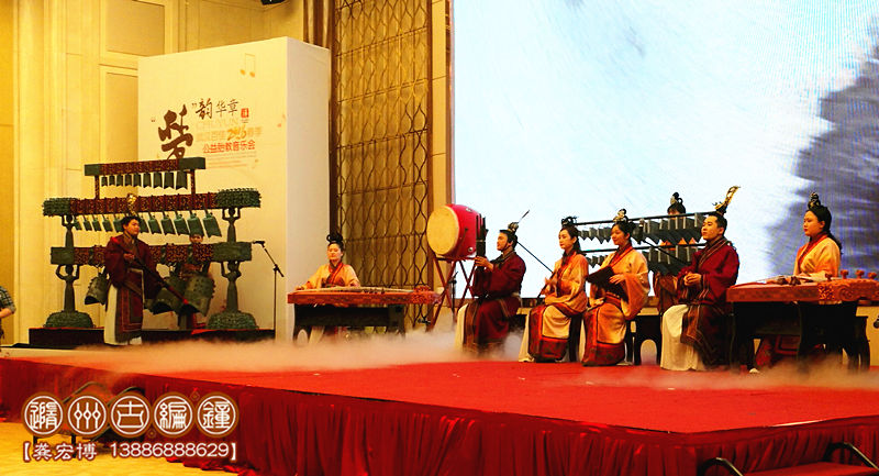 1、小型演出:一般由12-15件編鐘、編磬等配套樂(lè)器進(jìn)行表演,編鐘總長(zhǎng)度不超過(guò)2.2米,配備1-4名樂(lè)師進(jìn)行演奏,舞臺(tái)要求3*3米以上,有伴奏音樂(lè)配合演出,適合室內(nèi)小型宴會(huì)、展會(huì)等環(huán)境使用。