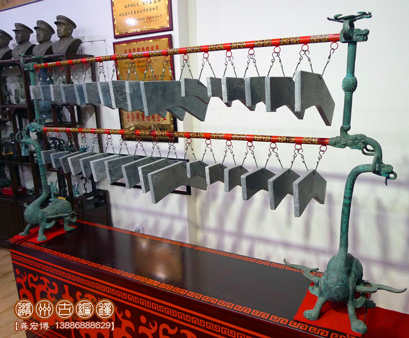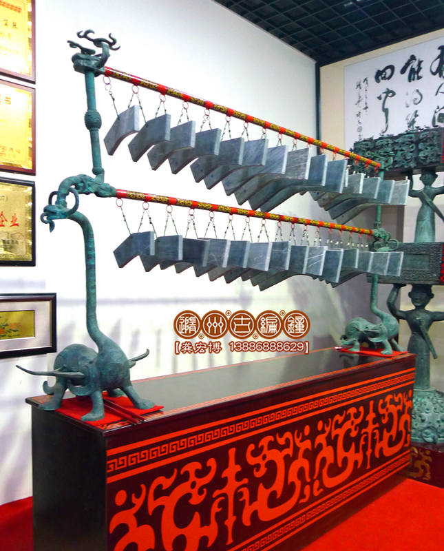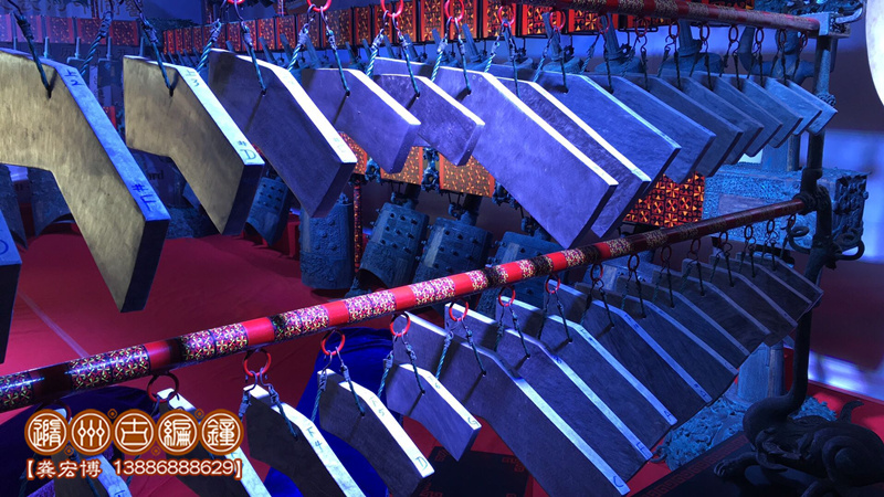 隨州市古編鐘文化發(fā)展有限公司通過考證歷史資料進行研究分析,并八方尋找石源,終于將這套2400多年前的戰(zhàn)國初期大型編磬復(fù)制出來,其發(fā)音與原編磬的標(biāo)音銘文相符,低音渾厚洪高,高音明澈,音色優(yōu)美而動聽,音域達(dá)三個八度,可以旋宮轉(zhuǎn)調(diào),演奏多種樂曲。