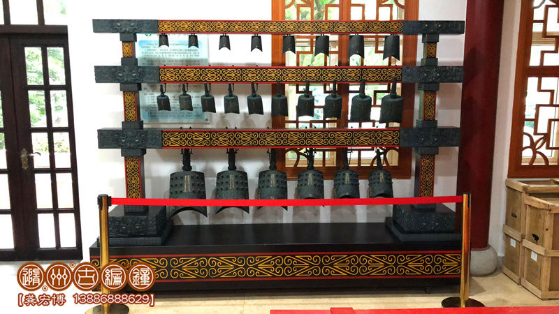 2019年,隨州古編鐘公司按客戶要求定制生產(chǎn)的24件編鐘(南樂歌鐘),編鐘為錫青銅鑄造并按442Hz調(diào)音,分3層懸掛方式排列,音階達(dá)3個(gè)半八度,可以演奏古今中外樂曲,可以和任何樂器搭配演奏。編鐘底座還配有萬向滑輪,在舞臺(tái)上可以很方便移動(dòng)位置,為客戶帶來了使用便利。